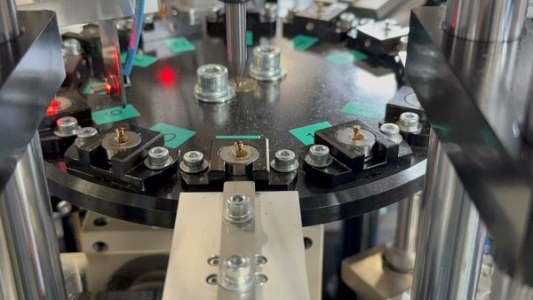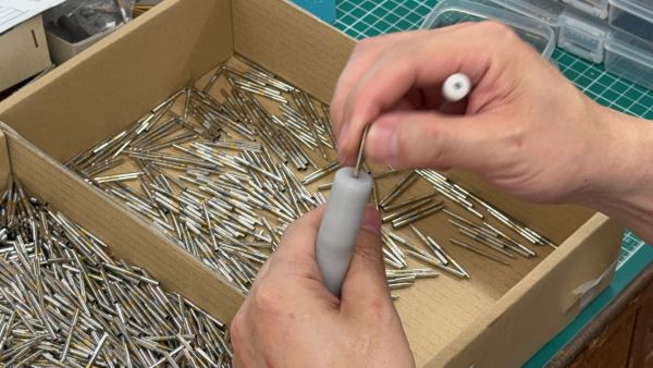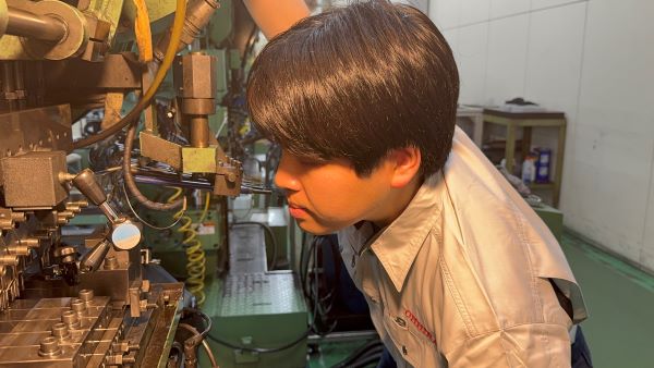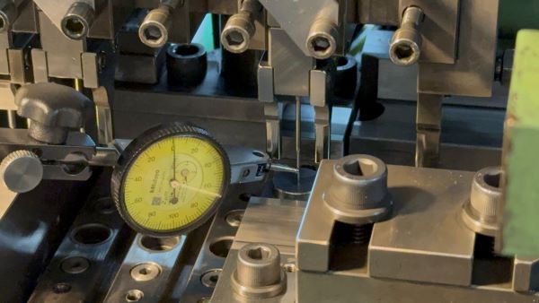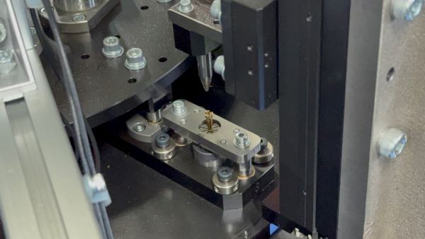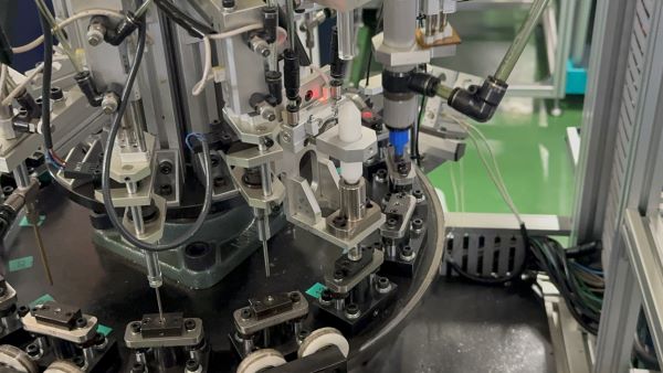二次加工とは、プレス・切削後の製品に更に加工を施すことです。例えば、チャックの側面のスリット加工、チャックを開閉させるための開き加工、ファインライナーのカシメ(圧力を利用して部材を変形させてチップと部品を接合する)加工です。その他に組立加工としてペンシルメカニズムの組立も自動化しております。弊社では、二次加工を行う機械を自社で設計・開発・生産しています。生産から二次加工まで一貫して行うことにより、多様な形状の加工を実現しています。