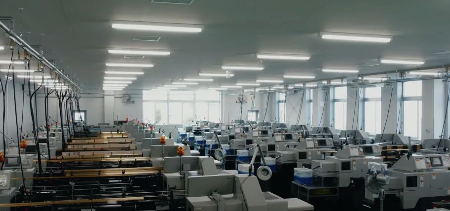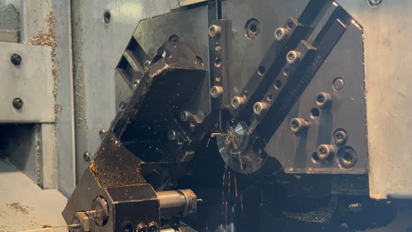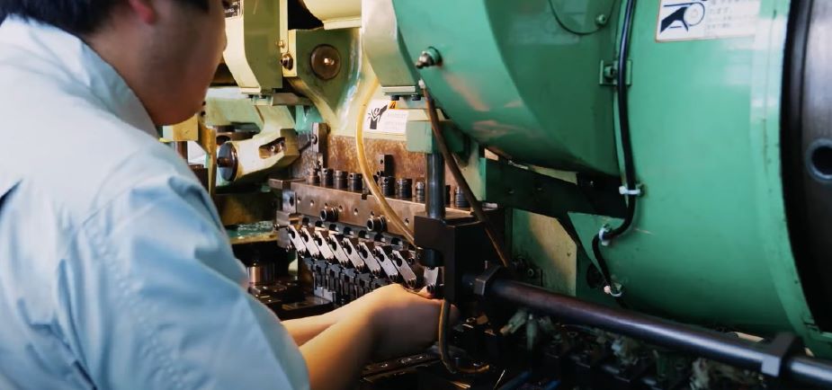 切削加工とは、特殊な刃物を用いて回転する材料を削り取る加工のことです。リンゴの皮むきのようなイメージです。NC自動旋盤機という、数値制御によって自動加工を行う機械で棒材を目的の形状に削ります。φ0.3mm未満の細穴加工やスリット、ローレットなどの特殊な加工も可能です。得意な加工サイズはφ0.5~φ8.0程度で、φ16まで加工することができます。特に、シャープペンシルのチャックは、月に300万個以上生産することができます。自動旋盤134台を駆使し、大量生産且つ低コストの実現しています。